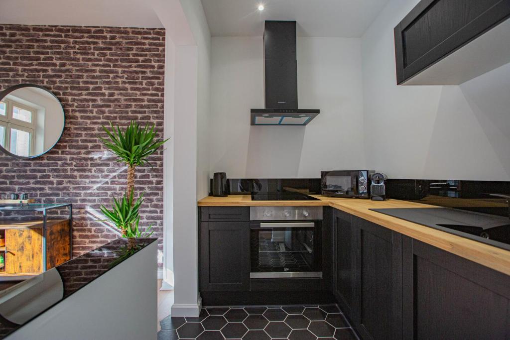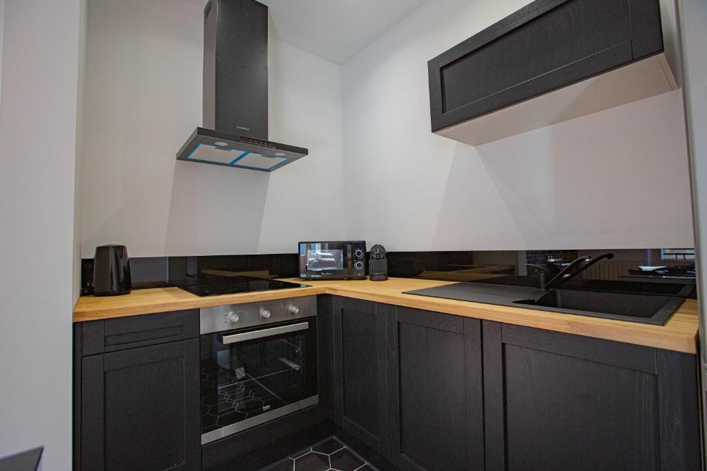 Cet appartement comprend une chambre, une télévision à écran plat ainsi qu'une cuisine entièrement équipée avec un lave-vaisselle, un micro-ondes, un lave-linge et un réfrigérateur.