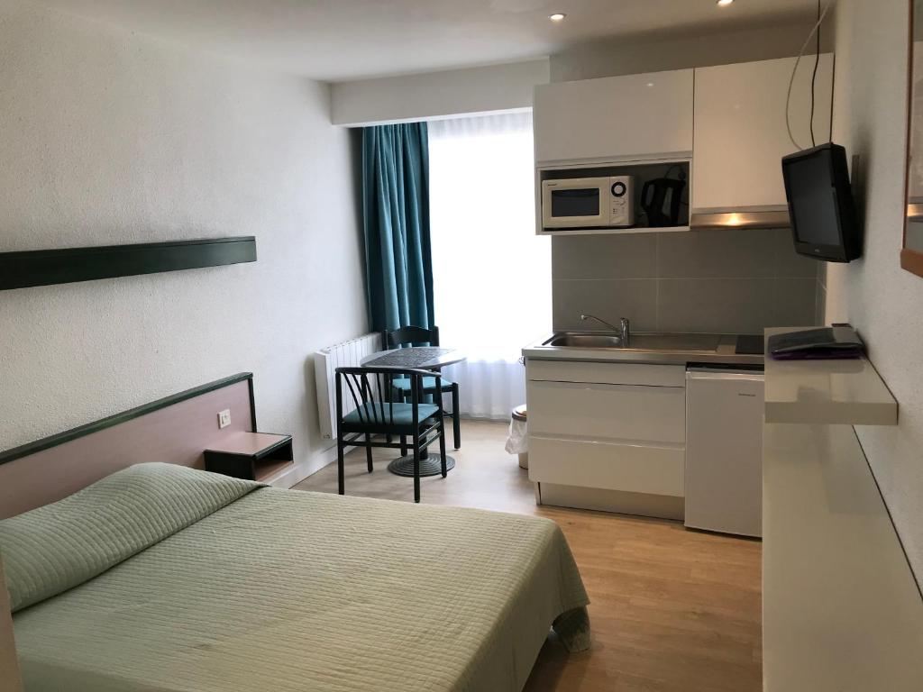 L'appartement comprend une chambre séparée, une salle de bains, une kitchenette entièrement équipée avec un coin repas et une télévision à écran plat.