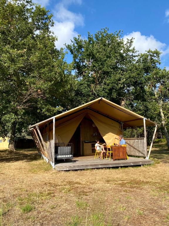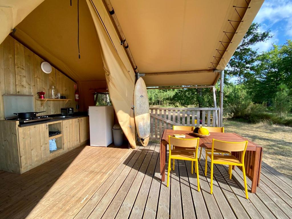 Situé à Carcans, le Camping la Kahute, tente lodge au coeur de la forêt dispose d'une terrasse. Vous aurez accès aux fléchettes.