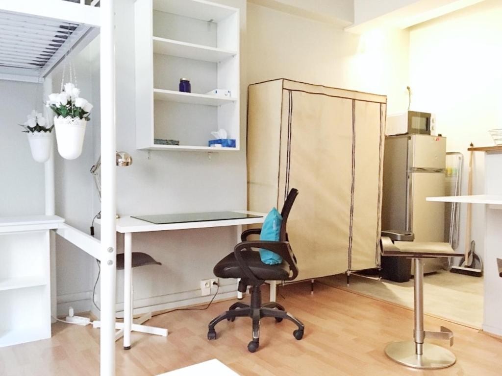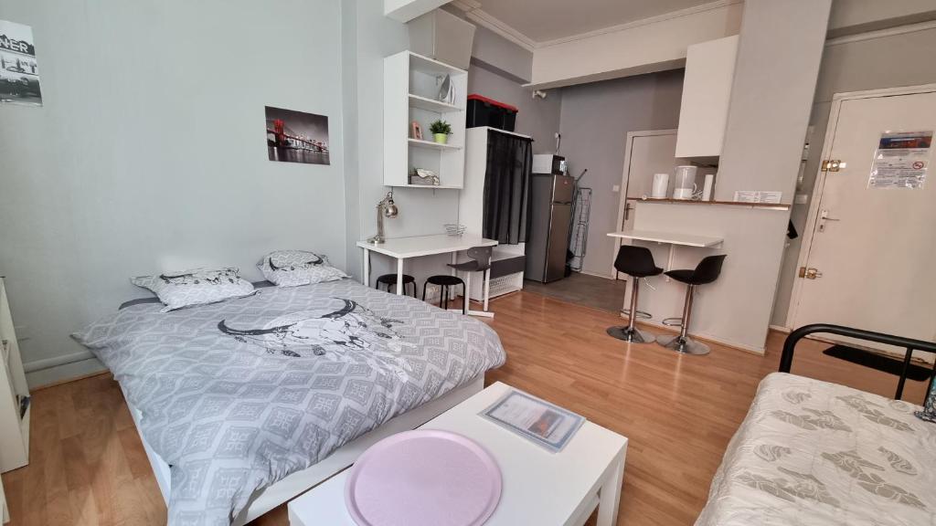 Cet appartement comprend une chambre, un salon, une télévision à écran plat, une kitchenette équipée avec un coin repas ainsi qu'une salle de bains pourvue d'une douche et d'un lave-linge.