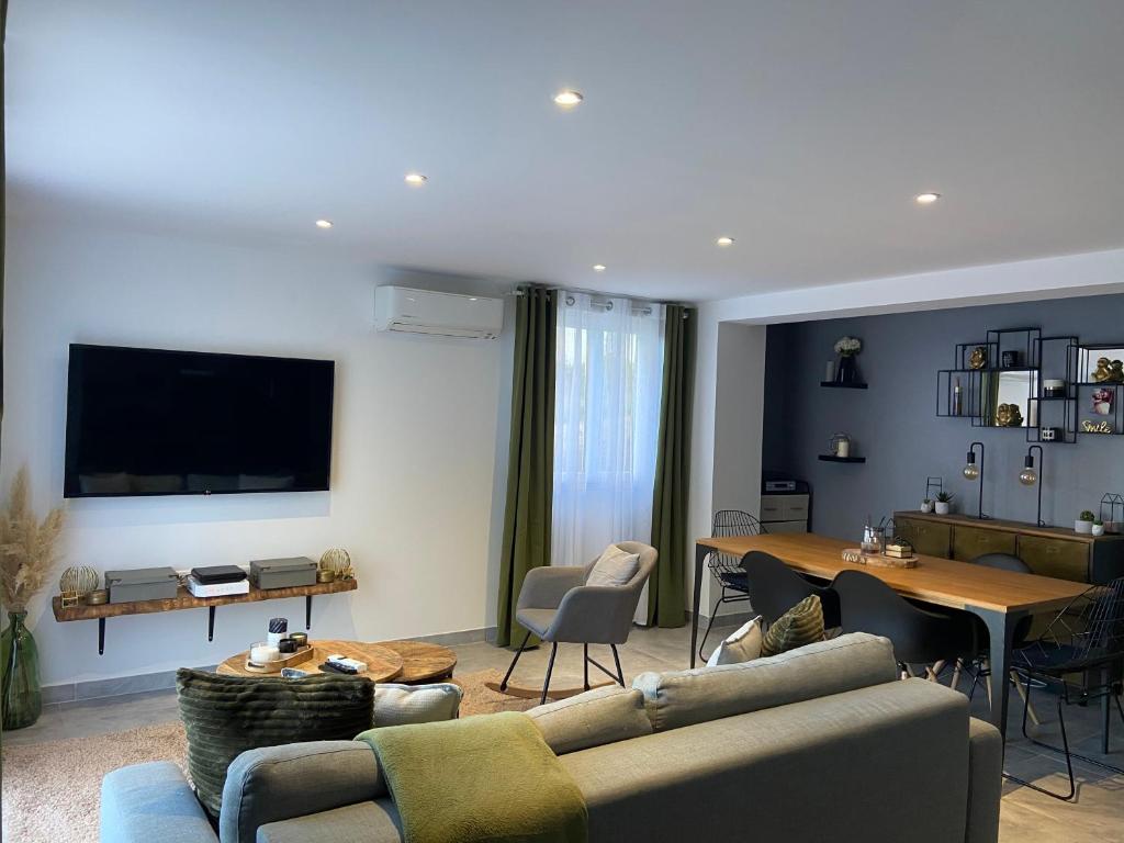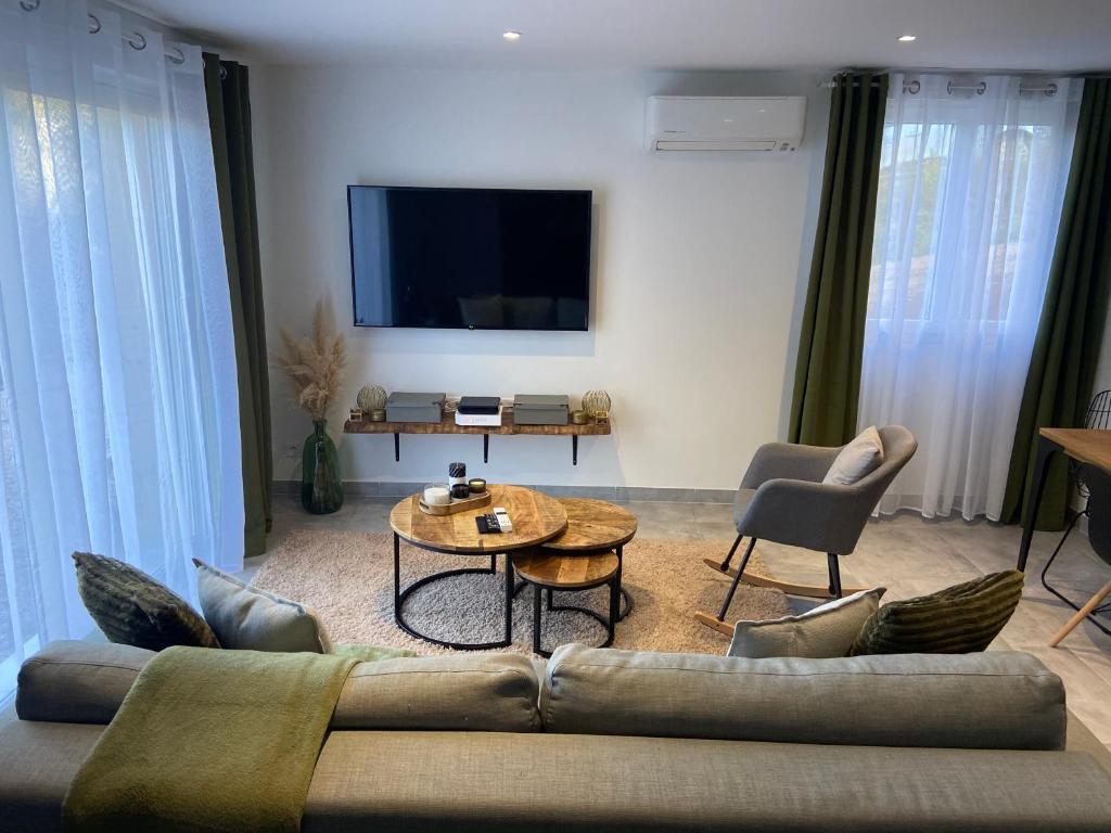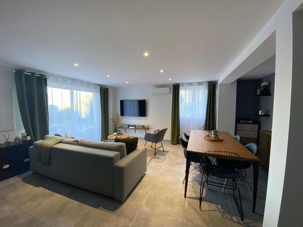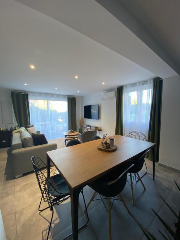 Rez de villa de 70m2 idéalement situé dans un petit hameau , à 7km des belles plages & à 7-8km du centre ville de Porto vecchio . Voiture obligatoire Une grande chambre avec un lit 160x200 (possibilité d’y mettre un lit de bébé) Une pièce de vie avec un canapé lit (2 personnes) ouverte sur la cuisine équipée , avec un jardin pour y passer vos début de journée ou bien même y faire un barbecue .