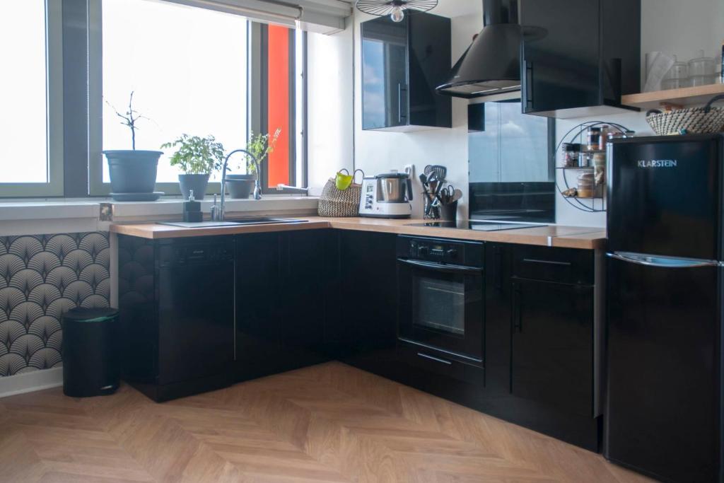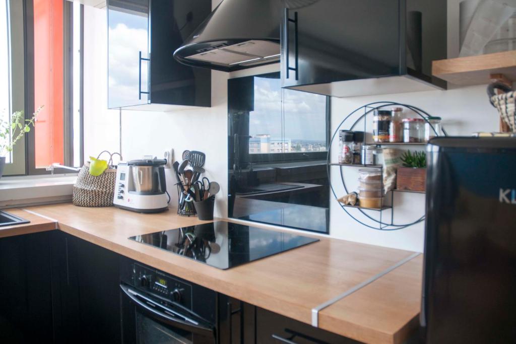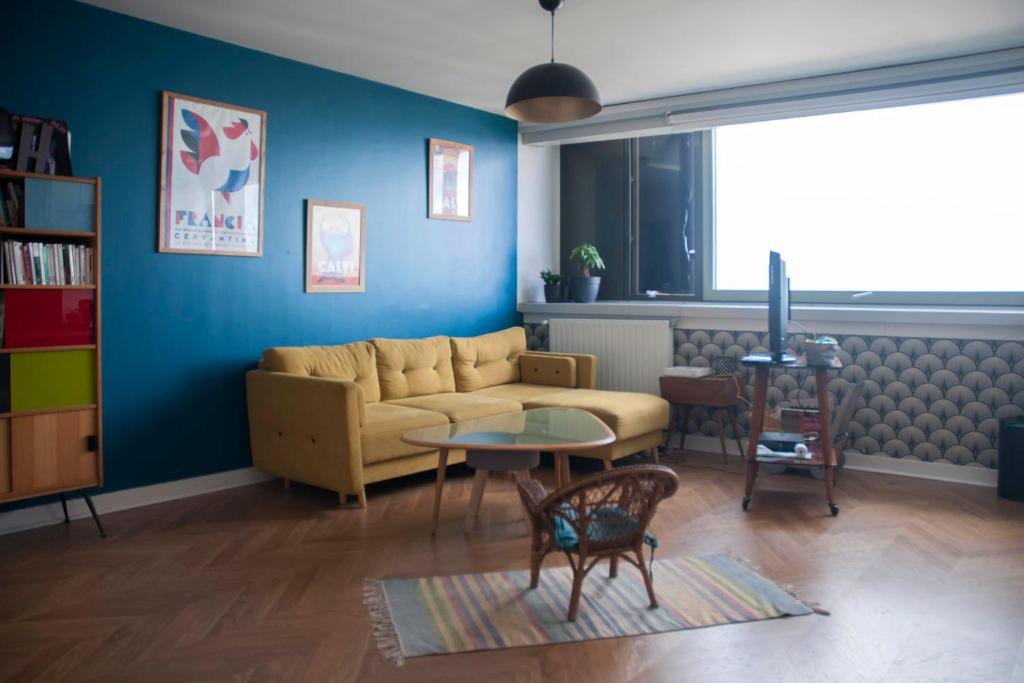 Bienvenue chez moi ! Je vous accueille dans mon logement de 46 mètres carrés en plein coeur de Bagnolet, localisé au 15ème étage avec ascenseur. Il est idéalement situé proche de la capitale et de plusieurs arrêts de bus et de métro. Vous pourrez vous promener dans un quartier agréable et découvrir Montreuil et Bagnolet! Situé à Bagnolet, le logement est très coloré et très confortable. Il est composé d'une grande chambre, équipée d'un lit double et d'un bureau de travail, et d'un salon très lumineux avec télévision et canapé convertible pouvant accueillir 2 autres personnes et avec une vue magnifique sur les hauts de Montreuil. La cuisine ouverte est entièrement équipée (plaques, four, frigidaire, lave-vaisselle). La salle de bain est très fonctionnelle, avec une grande baignoire, un lavabo et une machine à laver/sèche linge. Vous serez très bien desservis par les transports en commun, pour flâner dans tout Bagnolet et ses alentours ! Le quartier offre une proximité immédiate avec le 20ème arrondissement de Paris. Le logement se situe en face du Parc des Guilands, ce qui est très agréable pour faire toutes vos balades.