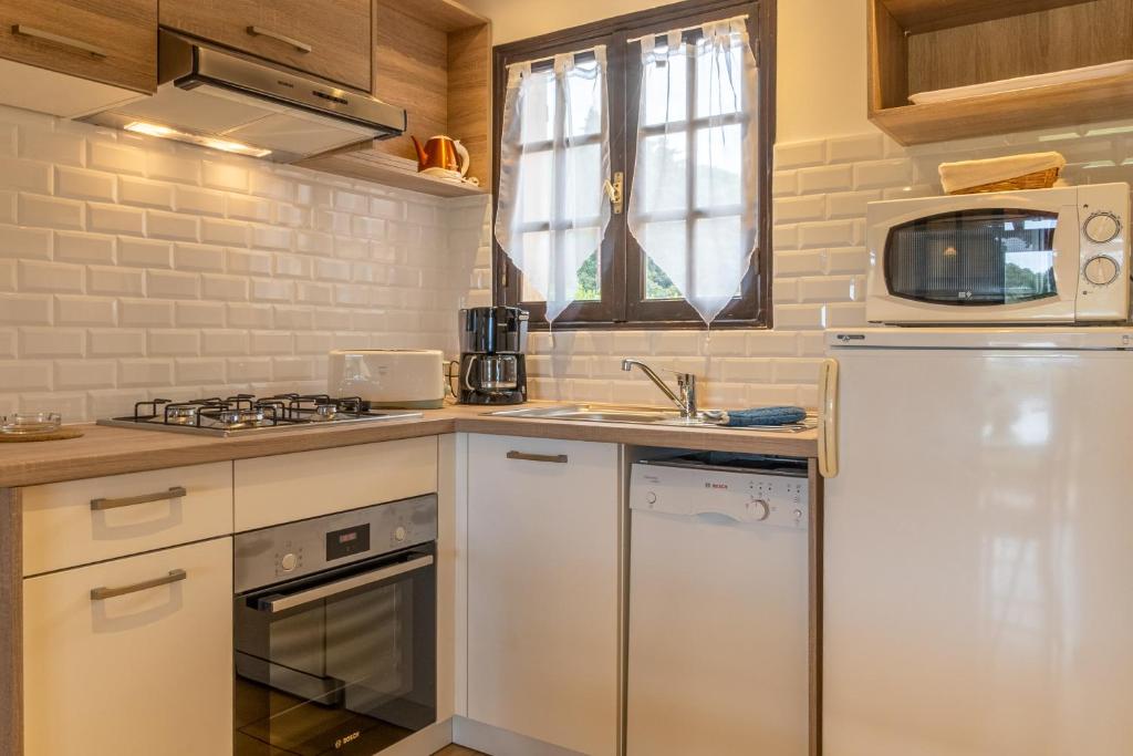 Cet appartement climatisé comprend une chambre séparée, une salle de bains ainsi qu'une kitchenette entièrement équipée avec un réfrigérateur et un four.