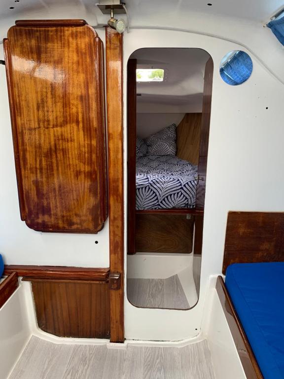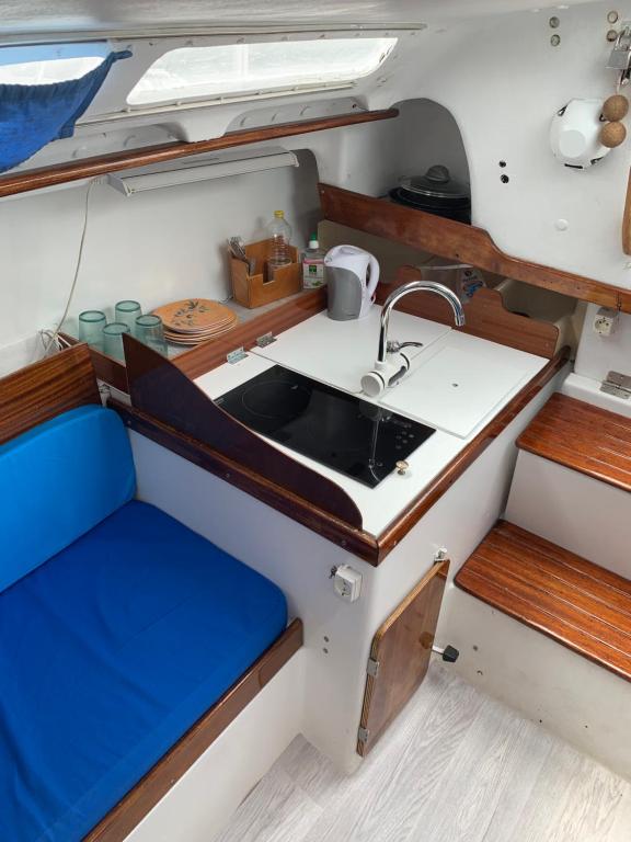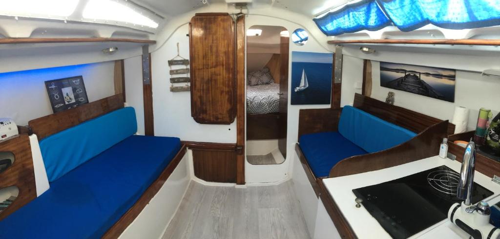 Ce bateau climatisé comprend une chambre séparée, un salon, une salle de bains ainsi qu'une kitchenette entièrement équipée avec un réfrigérateur et des plaques de cuisson.