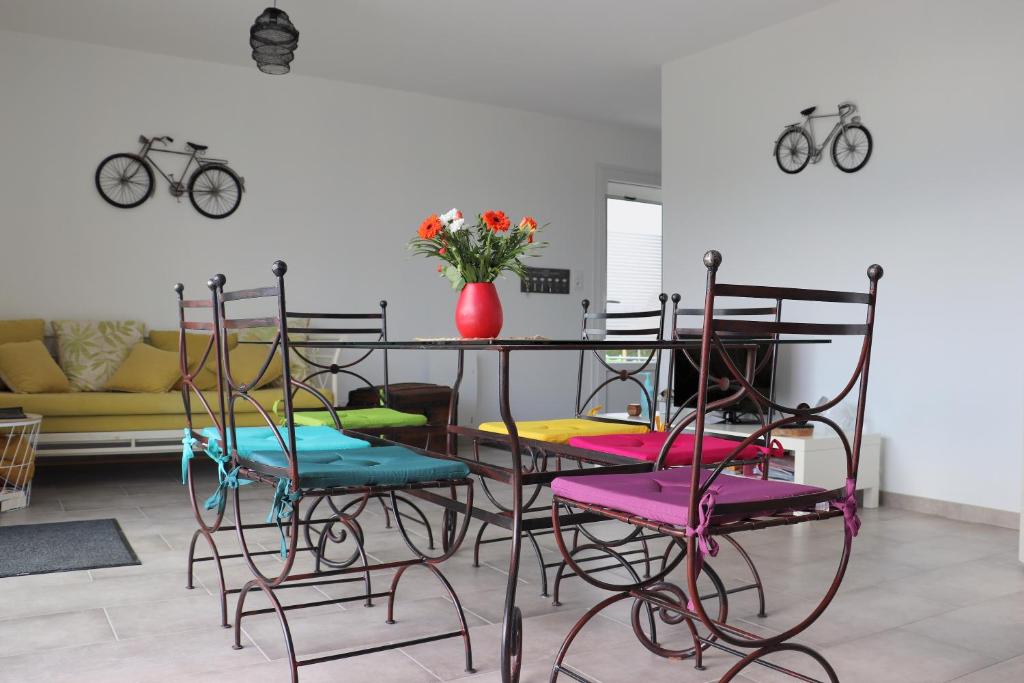 Logement de 60 m², plain-pied pour 4/6 personnes, non fumeurs et adapté aux personnes à mobilité réduite : - 2 chambres (2 x 90x190cm, 1 x 160x200cm, 1 canapé convertible 2 places) - Tout équipé (eau adoucie, cuisine équipée, TV, machine à laver, WIFI, équipements bébé …) - Terrasse équipée - Abri de jardin - Terrain clôs de 400 m² avec aire de jeux ... Gîte idéalement situé en retrait de la rue, sans vis à vis de la terrasse avec vue sur la nature, propriétaire sur place mais vous serez totalement indépendant, le calme est assuré ! Livraison à domicile de viennoiseries et de pains tous les jours le matin sauf le dimanche et passage d'autres commerçants ambulants Les draps et le forfait ménage sont en option avec supplément ! N'hésitez pas à nous contacter pour plus de renseignements ! Au plaisir de vous accueillir au vert , à quelques kilomètres de la grande bleue ! N'oubliez pas votre bicyclette !