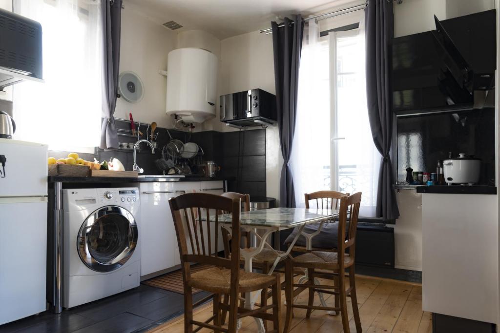 Cet appartement comprend une chambre, une cuisine avec un réfrigérateur et un four, un lave-linge ainsi qu'une salle de bains.