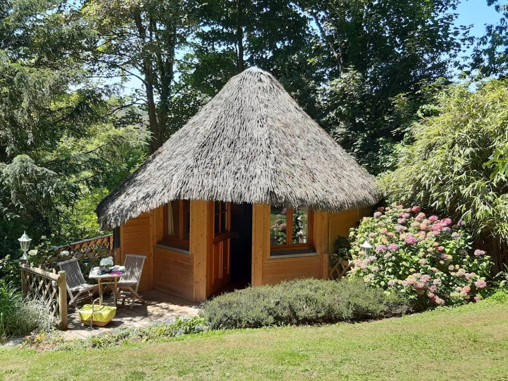 Amoureux d'Étretat, Laure et Philippe s'y installent en 1999. Ils achètent un terrain boisé, situé prés du centre ville à 1km de la plage. Philippe a transformé l'endroit en un lieu de repos dans lequel une petite hutte fait son apparition ou il fait bon vivre.