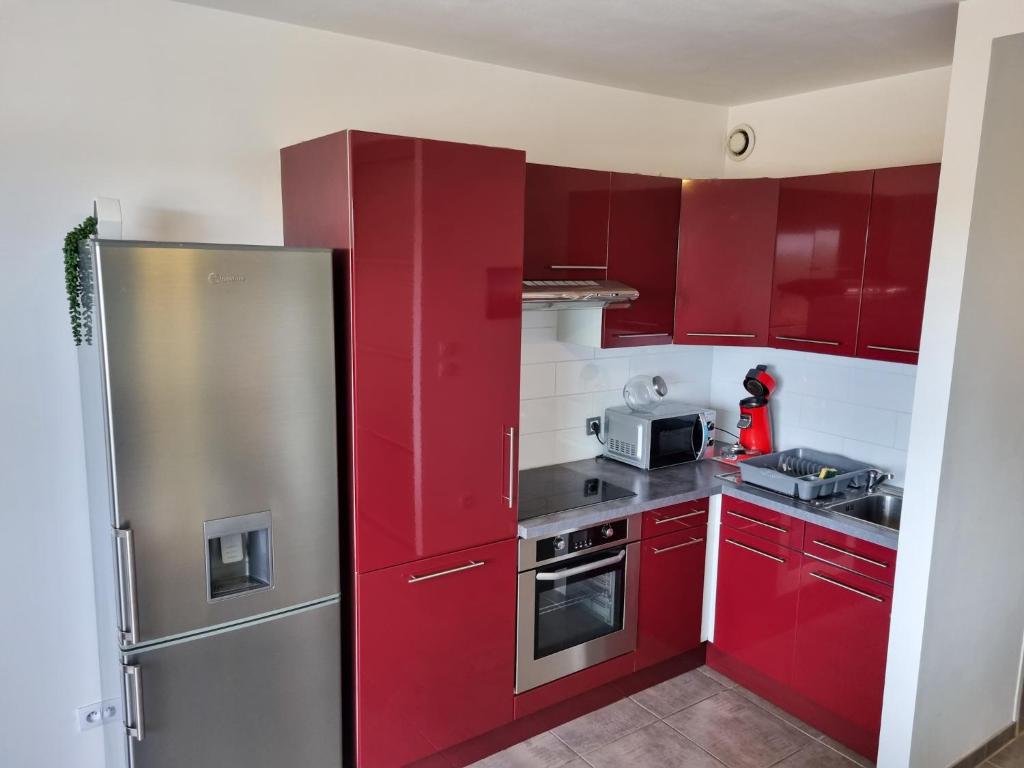 Cet appartement comprend une chambre, une télévision à écran plat ainsi qu'une cuisine entièrement équipée avec un micro-ondes, un réfrigérateur, un lave-linge et un four.