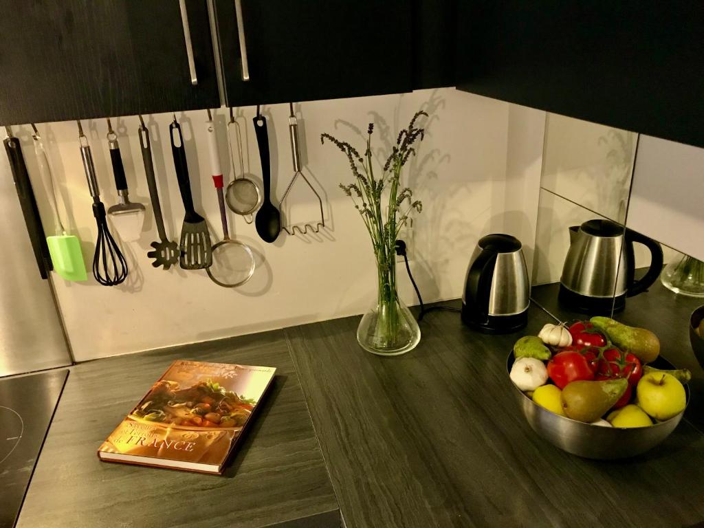 Grand salon ouvert sur la cuisine. Décoré avec goût, nous l’espérons, il dispose d’un canapé qui peut s’ouvrir en lit double pour plus de confort. Calme et lumineux, parfait pour s’adonner aux plaisirs de la lecture, du piano ou même de la couture. Il y a également quelques livres sur nos différents centres d’intérêts (cinéma, musique, peinture, architecture) ainsi que de belles plantes de se détendre de la meilleure façon après une longue journée d’escapade dans Paris. Cuisine entièrement équipée qui contient frigo, four, lave-vaisselles ainsi que plein d’ustensiles de qualité pro (grille-pain, mixeur, auto-cuiseur de riz, poêles et casseroles de toute taille). Les placards sont pleins d’épices trouvées dans nos différents voyages afin de continuer votre voyage tout en étant à la maison. Chambre : Elle dispose d’un lit double queen-size (160x200) ainsi que de deux tables de nuit. Très calme, elle est un parfait cocon pour se reposer. Les draps peuvent être fournis, sauf si vous préférez amener les vôtres. Deux étagères sont à votre disposition pour y ranger vos effets personnels. La salle de bain a dispose d’une baignoire un lavabo et une machine à laver. Toilettes séparées.