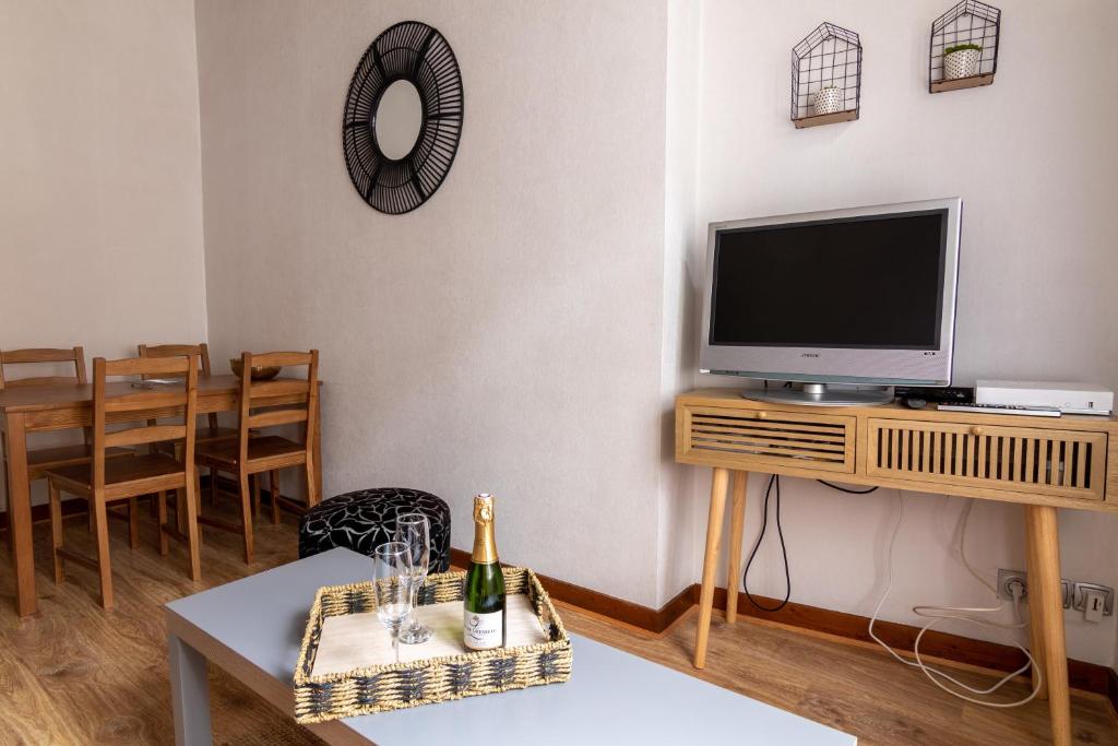 Cet appartement comprend une chambre et un salon avec une télévision à écran plat.