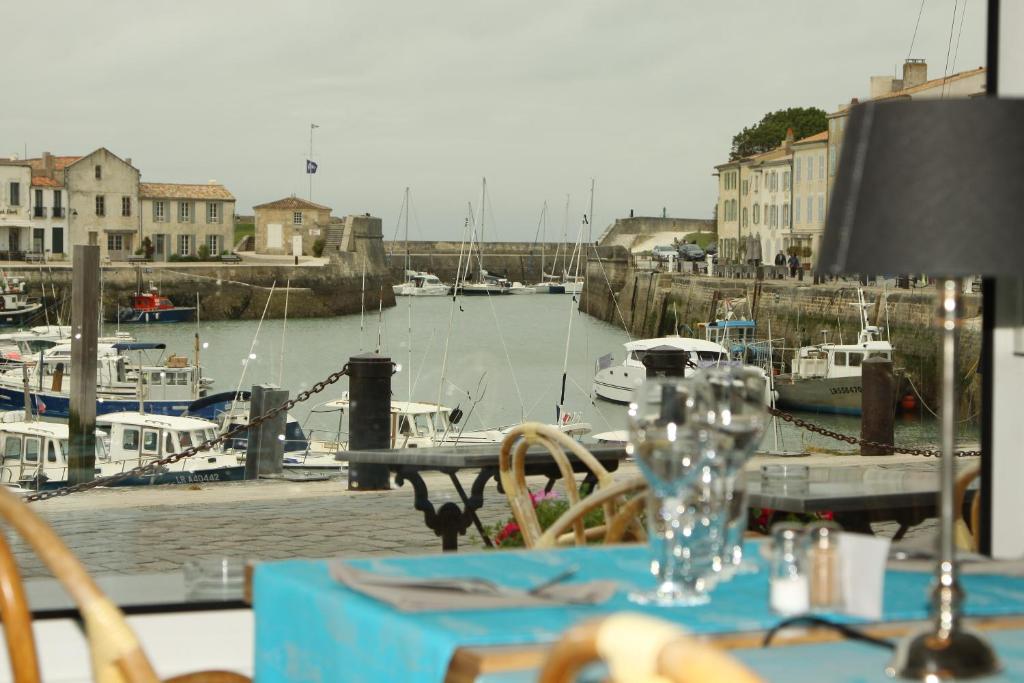 Le restaurant du Les Colonnes sert une cuisine maison traditionnelle et dispose d'une grande terrasse surplombant le port.