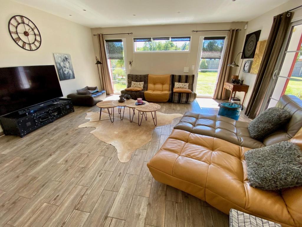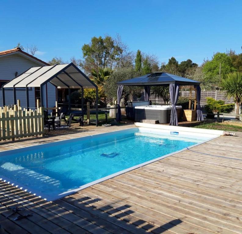 Maison moderne sur un très grand terrain de 2000m2 dans un cadre rural idyllique avec piscine au sel chauffée de 7.5m x 3.5m (construction se termine en printemps 2021) et jacuzzi . Le jardin est paysagé et possède de très beaux espaces extérieurs avec salon de jardin et barbecue. Situé entre Maubuisson et Carcans, la maison offre un large éventail de possibilités de sports nautiques au bord du lac Carcans (à environ 6 km), et des journées de plage relaxantes à l'océan (à environ 10 km). Des magasins et des restaurants se trouvent à environ 1,5 km. À seulement 200 mètres de la maison, il y a aussi une piste cyclable qui mène aux plages du lac et de l'océan. La maison est très moderne et confortablement meublée, elle est très bien équipée. Grand salon avec cuisine américaine intégrée. 3 chambres (2x lit double 1,80m, 1x lit double 1,40m) et un bureau ouvert, séparé par un paravent, avec un canapé lit 1,60m. 2 salles d'eau et 2 WC. La propriété est entièrement clôturée, parking sur la propriété.