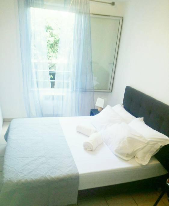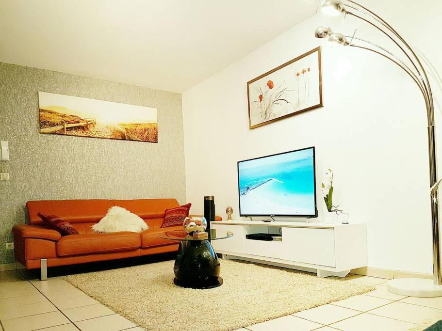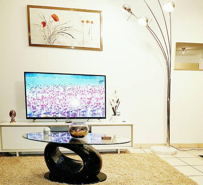 Cet appartement comprend une chambre, une cuisine avec un micro-ondes et un réfrigérateur, une télévision à écran plat, un coin salon et une salle de bains.