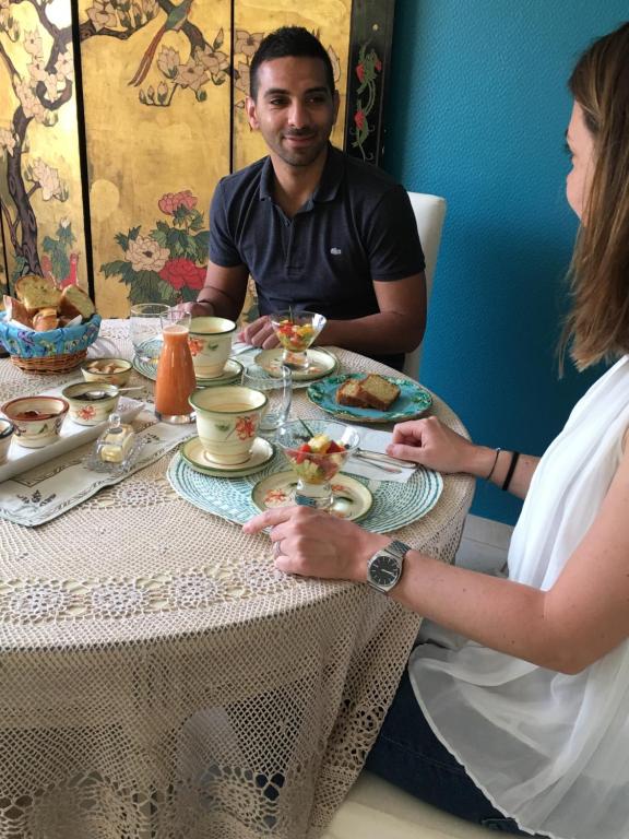 Le petit-déjeuner est servi dans la salle à manger ou dans le jardin. Il se compose de brioches et de confitures maison, de salade de fruits, ainsi que de jus de fruits frais.
