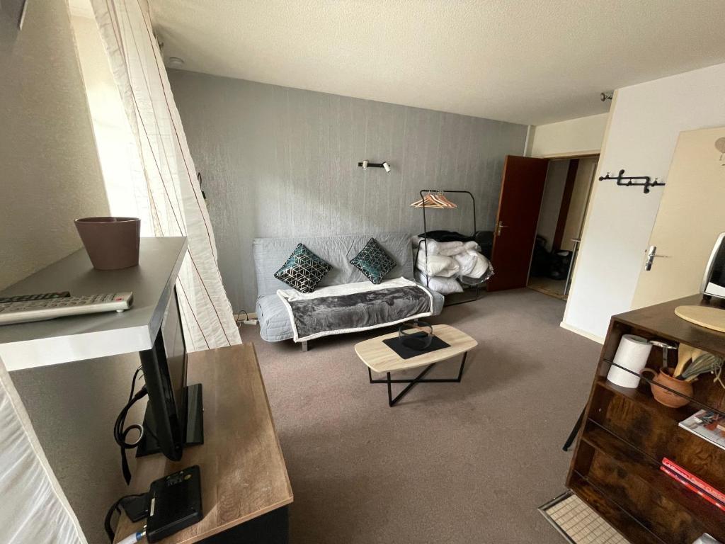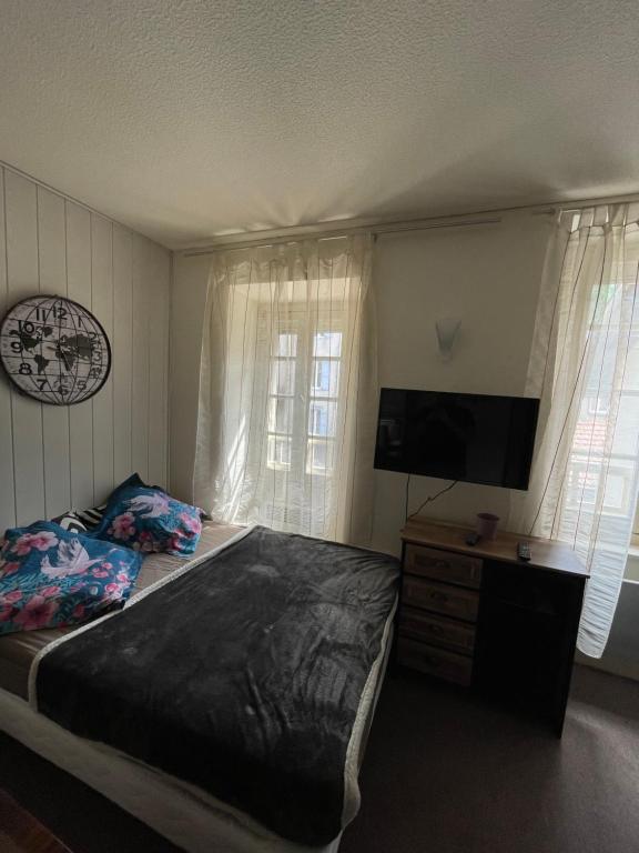 Cet appartement comprend une chambre, une télévision à écran plat, un coin repas ainsi qu'une cuisine équipée d'un réfrigérateur et d'un four.