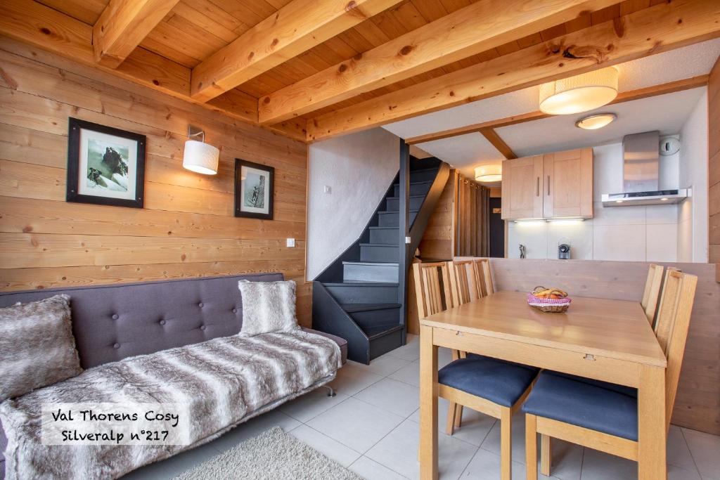 Duplex Silveralp 217 Pied des pistes Entièrement rénové. 3 chambres séparées. 6 personnes. wifi Emplacement exceptionnel: cet appartement de 47m2, est situé en plein coeur de val Thorens, juste en face des écoles de ski, dans l'une des rue les plus calmes de la station. Plein sud avec terrasse. Vue montagne exceptionnelle. Décoration typique et raffinée Luxe et confort. Cet appartement est équipé d'un lave linge Zone de couchage: à l'étage, 3 chambres séparées. - 1 chambre avec 1 lit double 140cm, TV + DVD. Belle vue dégagée sur la montagne. - 1 chambre avec 2 lits superposés de 90 cm + 1 lit pliable 90 cm - 1 chambres palière (qui accueille l'éscalier) avec 1 lit double 140cm, TV + DVD Couettes confortables traitées anti-allergiques (220x240 pour les lits doubles et 150x200 pour les lits simples). Pas de sommeil organisé dans le salon. La hauteur du plafond dans les chambres est de 1,80 cm dans la partie la plus basse. Autres appartements disponibles dans la même résidence
