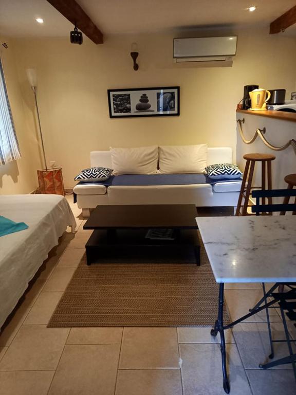 Cet appartement climatisé comprend une chambre, une télévision à écran plat et une kitchenette.