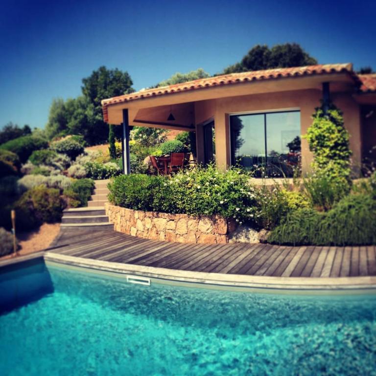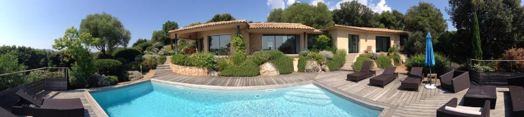 Valrossa est une villa moderne située en Corse du Sud, à 3 kms de Porto-Vecchio avec vue mer 180°. La maison de 250m2 accueille 10 personnes, et est composée de 5 chambres, 4 salles de bain, salle à manger intérieure et extérieure, salon, le tout avec climatisation & piscine chauffée (9x4m), wifi & TV sat. La maison est composée du bâtiment principal (3 chambres, 2 salles de bain, salon & salle à manger) et d'une annexe (2 chambres communicantes & 2 salles de bain).