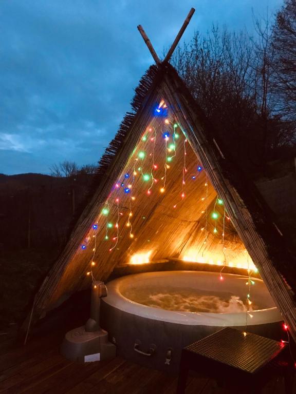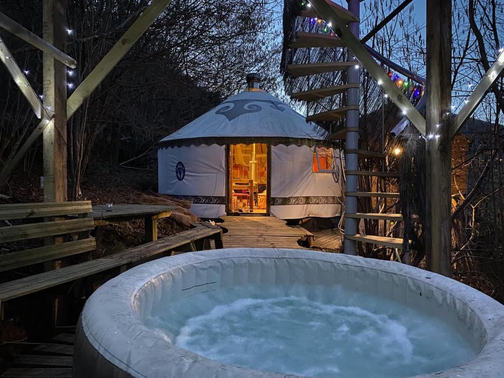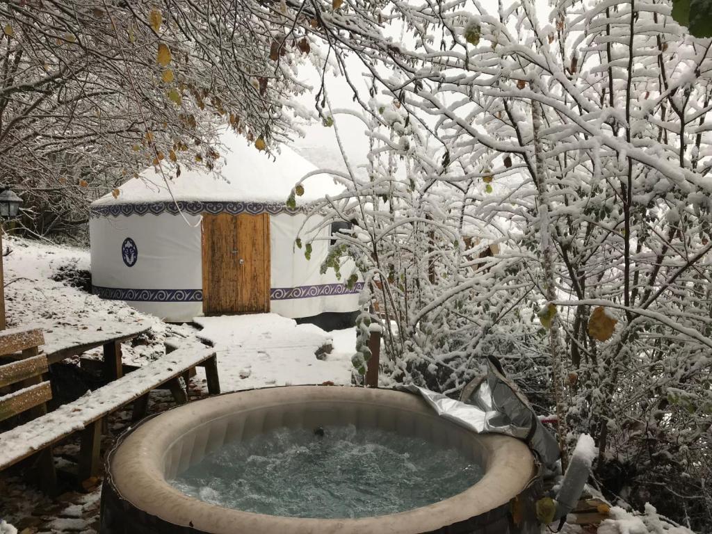 We are offering a peace of tranqulity and luxury in The Pyrenees. Enjoy sitting in a hot tub and then the comfort of your yurt and then take one of our delicious homemade 4 course dinners, using only the finest organic ingredients. We have a very comfortable dining room to share this experience as well as taking your gourmet breakfast. The view's are magnificant.